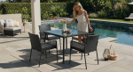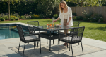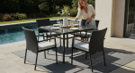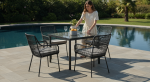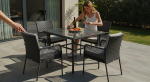 • Comfortabele armstoelen: De vier armstoelen zijn vervaardigd uit hoogwaardig zwart geweven synthetisch rotan/wicker over een stevig zwart metalen frame, wat zorgt voor een lange levensduur en weerbestendigheid. Elke stoel is uitgerust met een lichtgrijs gestoffeerd zitkussen, voor extra comfort tijdens lange zomeravonden.