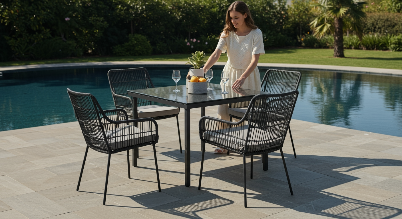 5-Delige Buiten Eetset: Glazen Tafel & Rotan Stoelen
