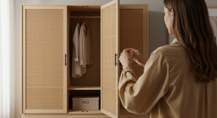 Natuurlijk Houten Kledingkast met Rotan Deuren