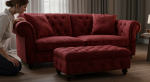 • Rijke Dieprode Bekleding: De bank en ottoman zijn vakkundig bekleed in een dieprode (bordeaux) pluche fluweelachtige stof, die niet alleen luxueus aanvoelt, maar ook een warme en uitnodigende sfeer creëert in elke ruimte. De stof vangt licht prachtig op, wat de diepte van de kleur accentueert.