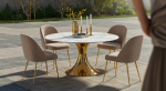 • Exclusief Marmeren Tafelblad: Een rond wit marmeren tafelblad met verfijnde grijze adering, biedt een duurzaam en gemakkelijk te onderhouden oppervlak met een luxueuze uitstraling.