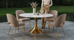 • Gecoördineerde Gouden Details: De slanke, taps toelopende goudkleurige poten van de stoelen harmoniëren perfect met de tafelbasis, wat resulteert in een cohesieve en elegante esthetiek.