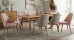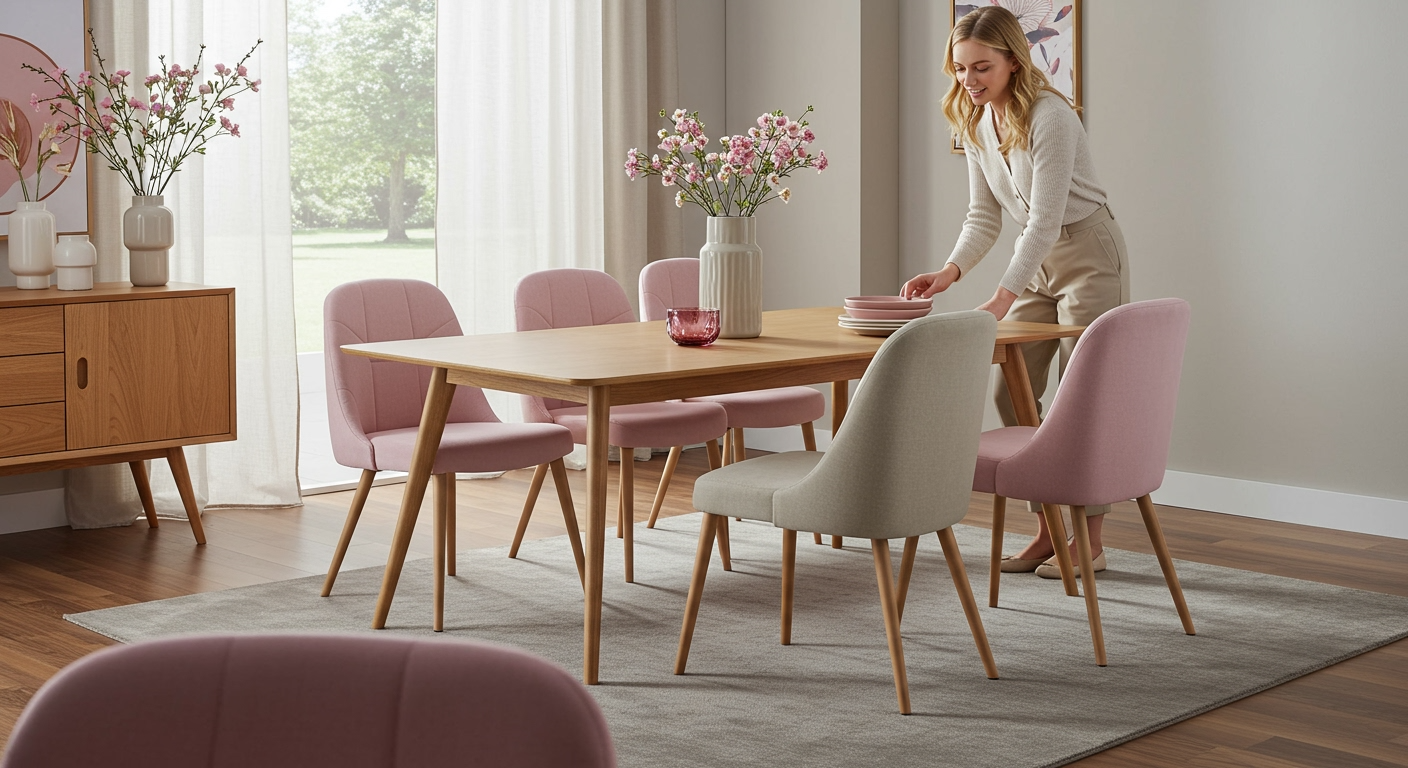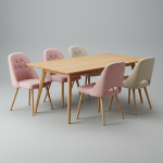 Verrijk uw eetkamer met deze prachtige, moderne eetgroep, een perfecte combinatie van elegantie en functionaliteit. Het hart van de set is de stijlvolle, rechthoekige eettafel, vakkundig vervaardigd uit lichtgekleurd hout en rustend op sierlijke taps toelopende poten. Deze tafel biedt een ruim oppervlak voor gezellige diners en levendige bijeenkomsten, waardoor het een centraal punt in uw interieur wordt.De set wordt gecompleteerd door zes uitzonderlijk comfortabele, gestoffeerde eetstoelen. Twee stoelen zijn uitgevoerd in een trendy blushroze stof, terwijl twee andere stoelen bekleed zijn met een zachte, neutrale lichtbeige stof. De overige twee stoelen, waarvan delen zichtbaar zijn, completeren deze harmonieuze kleurencombinatie. Elke stoel is voorzien van bijpassende licht houten poten, een zacht gebogen rugleuning en een royaal gecapitonneerd zitvlak voor optimaal zitcomfort. Deze eetgroep ademt een eigentijdse flair en past naadloos in diverse interieurstijlen, van minimalistisch tot Scandi-chic. Creëer een uitnodigende en stijlvolle sfeer voor zowel dagelijkse maaltijden als speciale gelegenheden. Investeer in deze veelzijdige eetset die bijdraagt aan jarenlang plezier en een sfeervolle ambiance in uw woning.