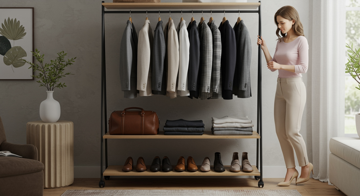 SKU: RU-09 Categories: Kleiderständer, Trendprodukte Tags: compact kledingrek, garderobe oplossing, garderoberek, halmeubel, houten planken, kledingkast alternatief, kledingopberger, kledingrek, metalen kledingrek, opbergoplossing, schoenenrek, slaapkamer organisatie, verrijdbaar kledingrek, vrijstaand kledingrek, woonaccessoires
