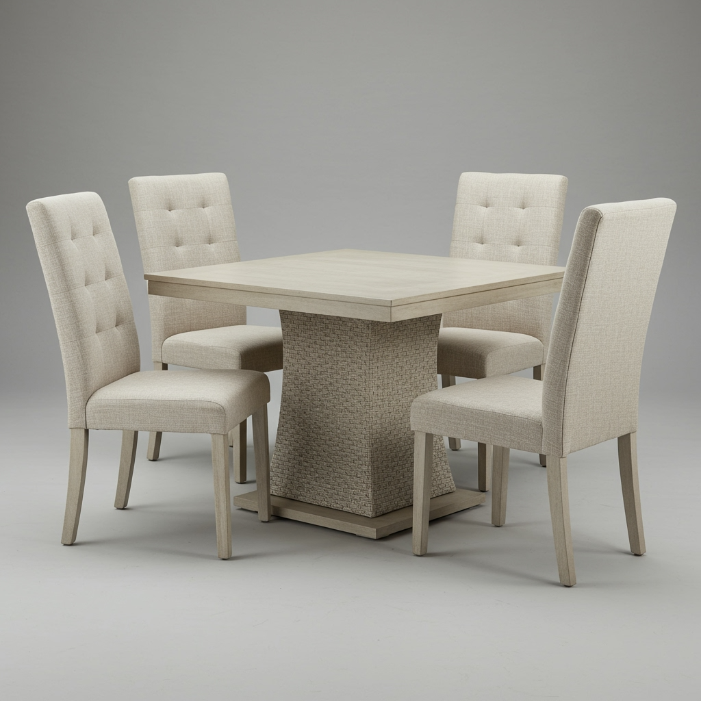 • Vierkante Eettafel met Sokkelbasis: De robuuste eettafel heeft een massief vierkant blad en een unieke rechthoekige sokkelbasis, alles uitgevoerd in een uniforme, lichte ‘greige’ tint. De subtiele geweven textuur op de basis voegt een vleugje verfijning toe en zorgt voor een stabiele, opvallende blikvanger.