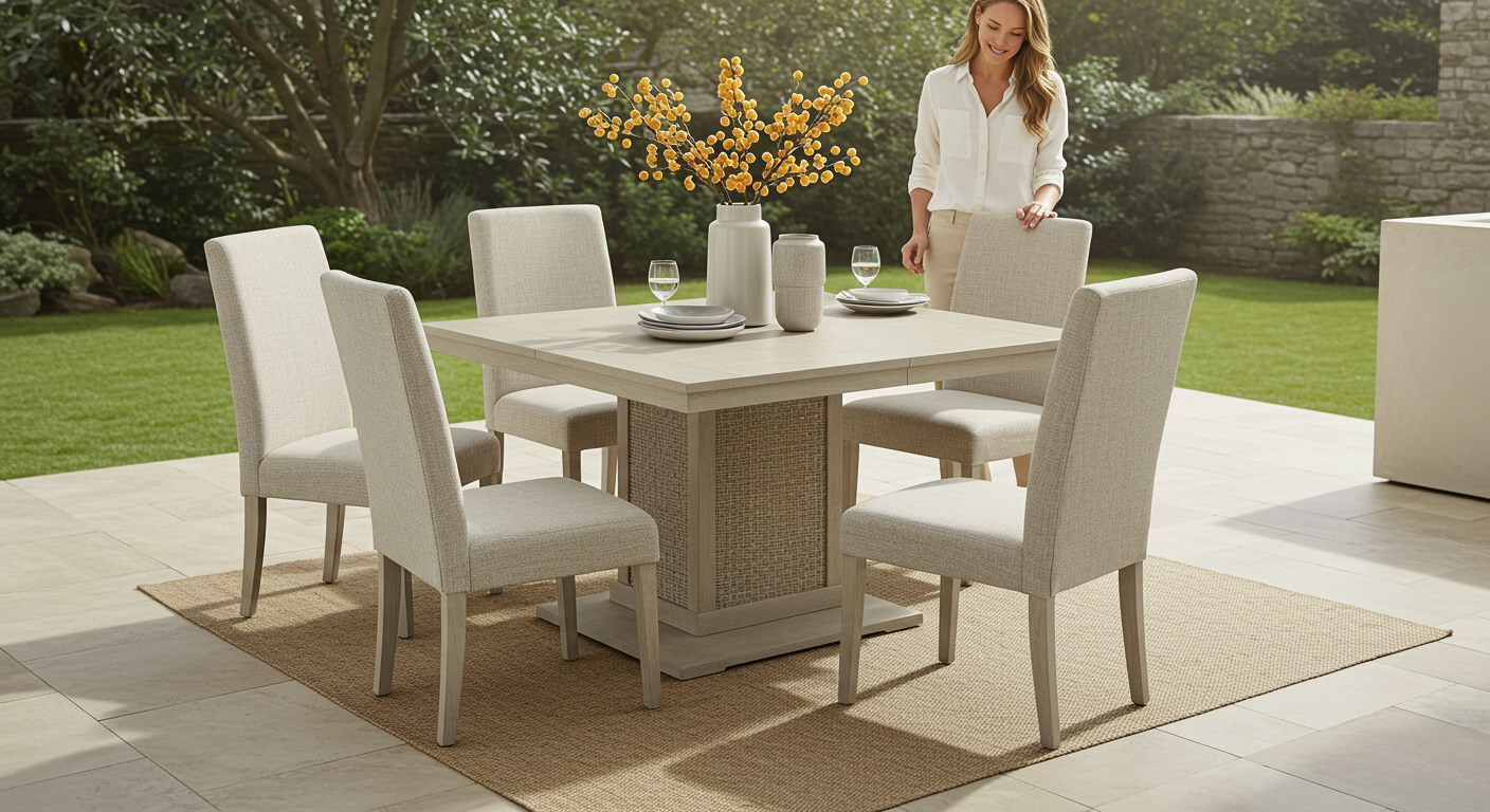 SKU: RU-19 Categories: Gartentischset, Trendprodukte Tags: Beige eetset, Compacte eetset, Design eetkamer, Eetset 4 personen, Eigentijdse eetkamer, Gestoffeerde eetstoelen, Greige meubelen, interieur design, Kwaliteits eetmeubilair, Lendenkussen stoel, Meubelset woonkamer, Moderne eetgroep, Stijlvolle meubels, Vierkante eettafel, Woondecoratie